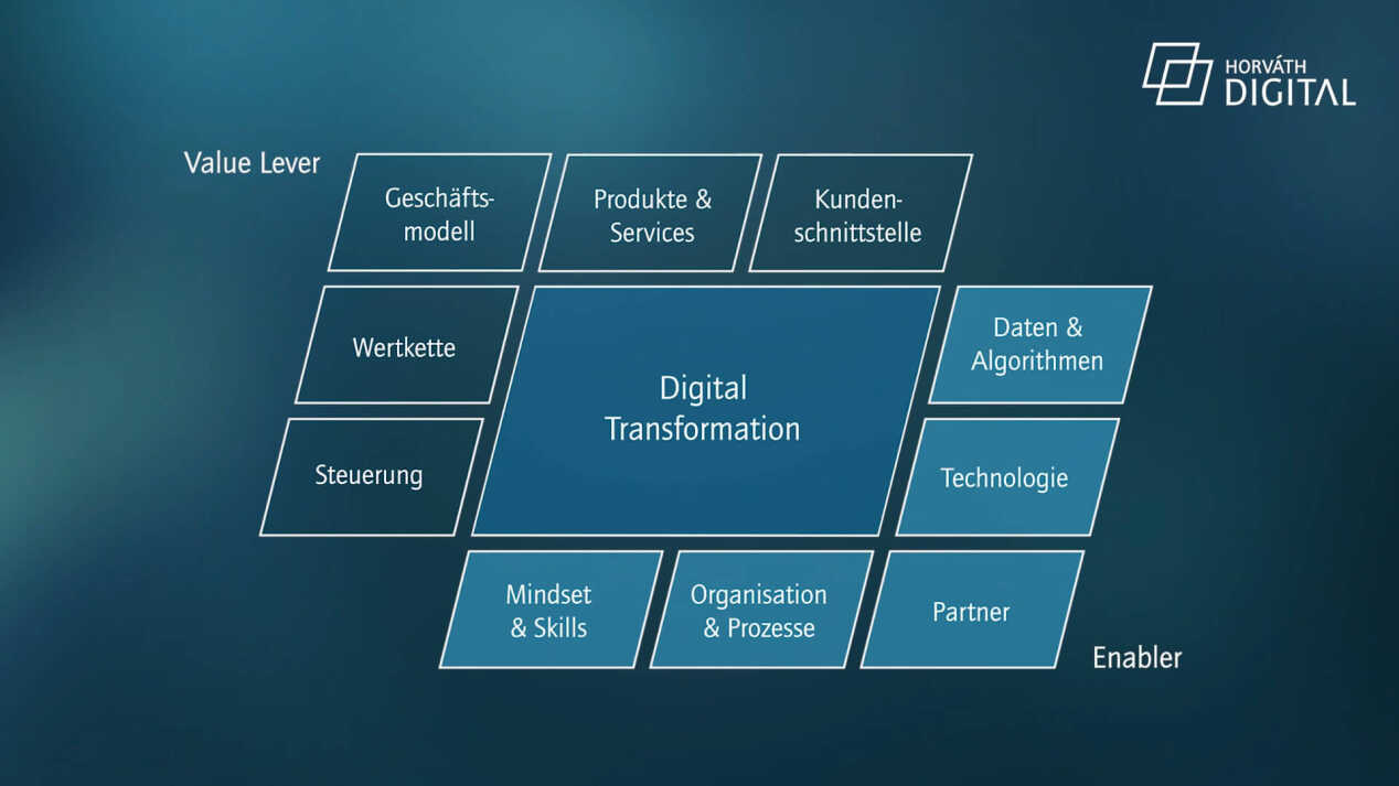 Horváth Digital bietet Ihnen das gesamte Dienstleistungsspektrum rund um die digitale Transformation – von der Entwicklung einer digitalen Strategie und eines digitalen Unternehmenszielbildes bis zur Implementierung des digitalen Betriebsmodells und seiner Digital Engine. Sie bekommen nicht nur brillante Konzepte, sondern auch funktionierende Lösungen. Deswegen übernehmen wir für diese die Konzeptions- und Umsetzungsverantwortung. Sie profitieren dabei von unserem leistungsstarken Partnernetzwerk.